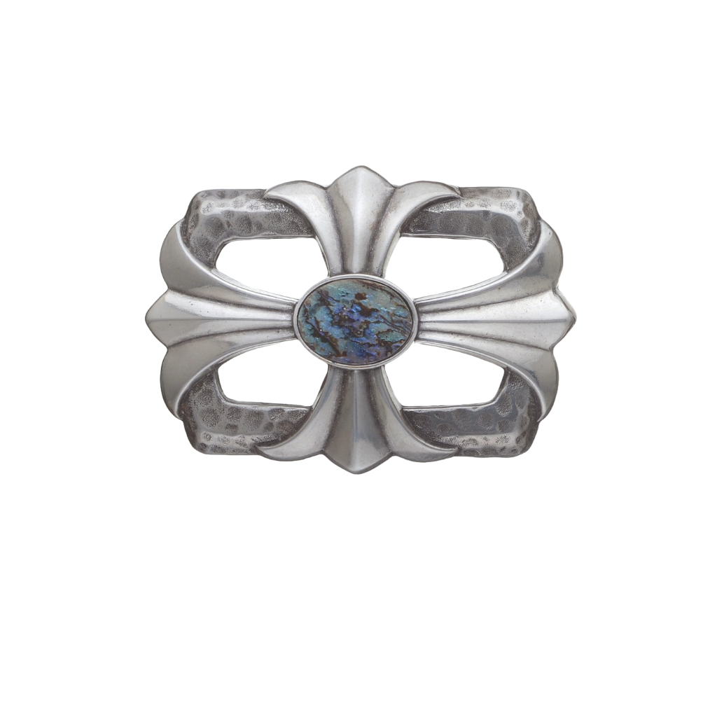 Cross Circle 40mm Belt Buckle – English Silver Finish + Cracked Paua Blue & Cracked White Mother of Pearl
